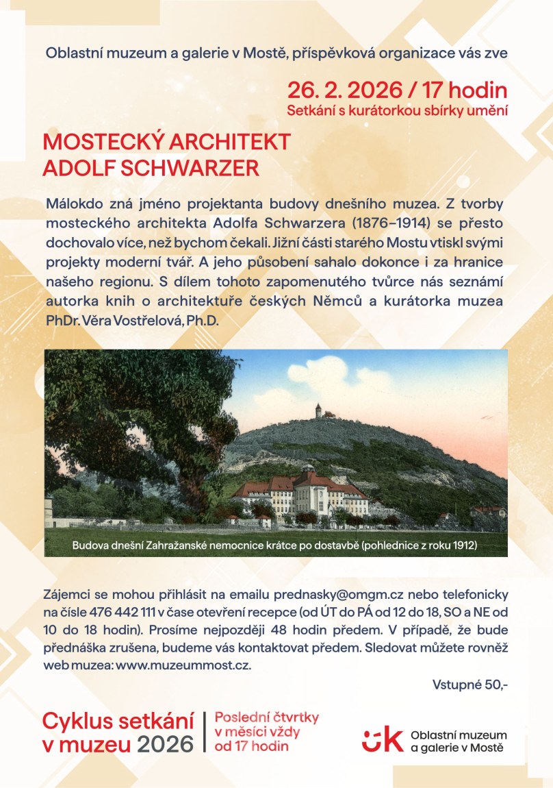› Detail › Mostecký architekt Adolf SchwarzerOblastní muzeum a galerie v Mostě, příspěvková organizace vás zve na setkání s kurátorkou ve čtvrtek 26. 2. 2026 v 17 hodin.
